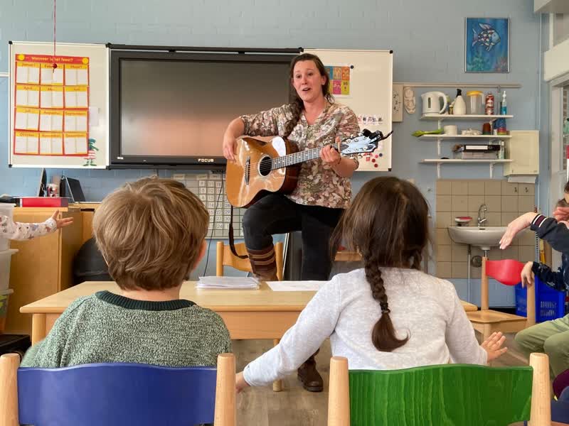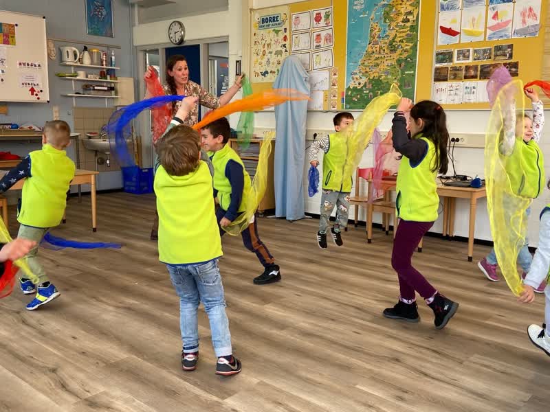 dat het klassieke reken- en taalwerk. De kleuters van groep-2 zingen en dansen over Rupsje Nooitgenoeg, begeleid door een muziekdocente Irene Versluis. Tussendoor worden worden er ook nog even woorden als 'cocon' en 'ontpopt' meegepikt.