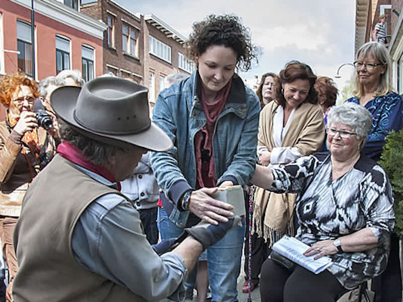 Een paar van deze steentjes werden ingemetseld door Gunter Demnig, de Duitse kunstenaar die deze vorm van herdenking heeft bedacht. Demnig reist hiervoor door heel Europa.