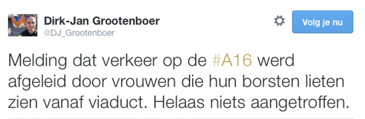De politie van Dordrecht ontving woensdagavond een melding dat twee vrouwen het verkeer op de Rijksweg A16 afleidde door hun blote borsten te tonen. De vrouwen toonden hun borsten terwijl ze op een viaduct stonden. Twittercop Dirk Jan Grootenboer werd ter plekke gestuurd, maar heeft de vrouwen “helaas” niet aangetroffen”, zo liet hij op Twitter weten.