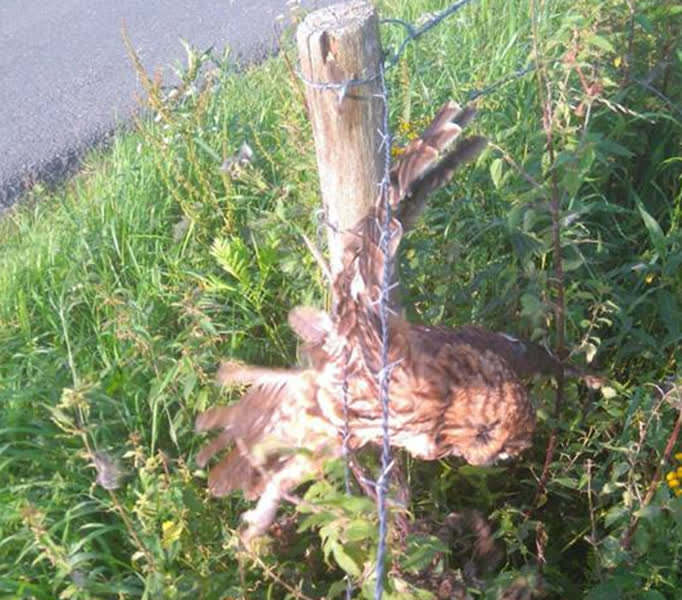 Boswachter Corné Bossers vond gistermorgen een bosuil in het prikkeldraad.