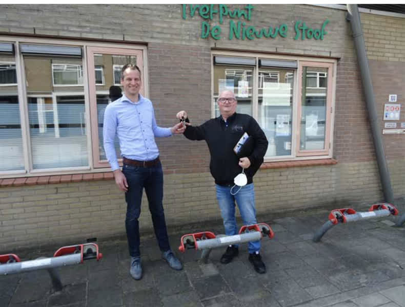 (OP FOTO: Op 20 april jl waren Jan Pieter Preesman (Gemeente Dordrecht) en Adrie van der Aa (Trivire) in de Stoof voor de laatste oplevering en de sleuteloverdracht.)