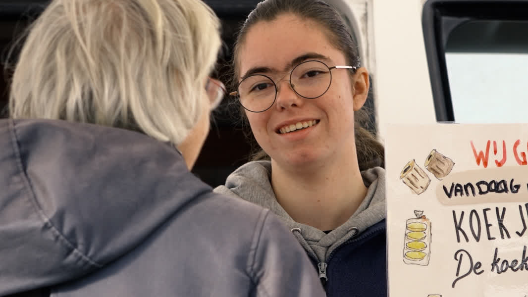 Eveline haar oudste kind is enthousiast de laatste koeken aan het verkopen. RTV Dordrecht