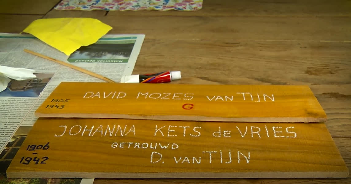 Tijdens het interview met RTV Dordrecht was Monique Mol, een van de vrijwilligers bij Villa TrösT, bezig met een bordje voor de familie Van Tijn. “Je kunt online allerlei informatie krijgen over de personen. Zo weet ik dat deze mensen in de Wijnstraat hebben gewoond. Daar liggen ook stolpersteinen voor hen. Alleen het huis stond er niet meer.”