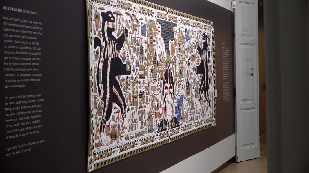 Hiermee is de studieschuld je eigen schuld geworden. De titel heeft een dubbele lading: alsof je er wat aan kunt doen, dat je precies in die periode ging studeren. Veldhuis maakte een veelbesproken wandkleed over hoe het leven van een student met schulden eruitziet, dat wordt tentoongesteld door het Dordrechts Museum. Het geweven tapijt van Veldhuis laat zich lezen als een stripverhaal. Wandtapijten zijn door de eeuwen heen vaak gemaakt om verhalen uit te beelden en actuele kwesties aan te kaarten.