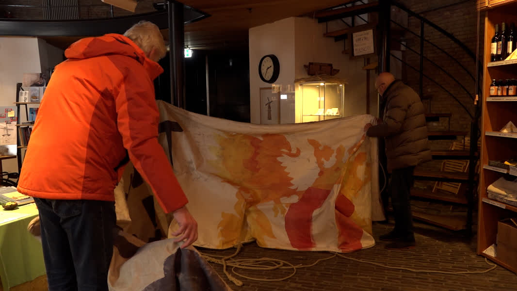 Het doek heeft zichtbare gebruikssporen. Het is wat bruin hier en daar en er zitten wat vlekken op. "Hij is zoals ie is en zo gaat hij het archief in. We zorgen er wel voor dat het zeil goed droog is, anders hebben ze daar bij het archief last van en dat moet niet nodig zijn."