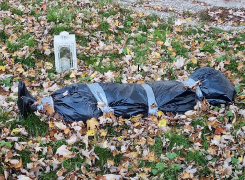 Een bewoner had een nep lijk in de tuin gemaakt met vuilniszakken en tape, alsof het lijk uit een rijdende auto was gedumpt. Dat bleek (gelukkig) niet het geval te zijn.