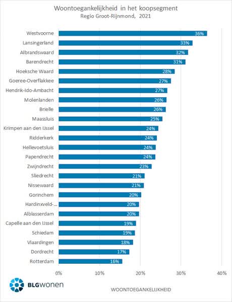 Voor zover overheden al niet doordrongen zijn van de noodzaak om meer woningen te creëren voor lage inkomensgroepen komt BLG Wonen met cijfers. Deze organisatie berekent voor zowel de huur- als koopsector hoeveel procent van de woningzoekenden binnen één jaar een huis vindt en vertaalt dat in een woontoegankelijkheidsscore. In geen enkele gemeente in de regio vindt meer dan 36 procent van de woningzoekenden binnen één jaar een woning.