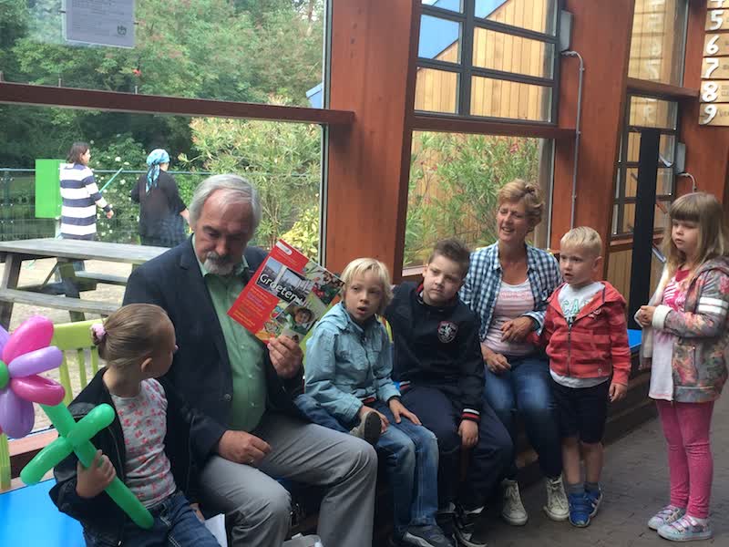 De wethouder leert vandaag de kinderen uit groep 2 van basisschool de Ammanschool dingen uit het educatieve magazine 'Groeten uit'.