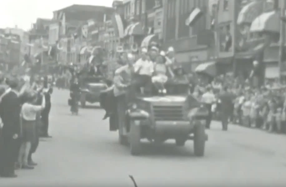 Op de beelden zien we uitgelaten Dordtenaren. “Vlak na het bekend maken van de capitulatie waren de eerste tekenen van de nieuwe vrijheid de Nederlandse vlaggen die overal in de stad werden uitgehangen. Aan het Stadhuis wapperde de Engelse vlag, als teken van hulde aan de bevrijders”, licht De Bruijn toe. “Burgemeester Bleeker werd daar op een overvol Stadhuisplein op 9 mei 1945 uitbundig toegejuicht door een uitzinnige mensenmenigte. De Engelsen en Canadezen werden meer dan hartelijk ontvangen door de Dordtenaren. Een optocht met wagens en tanks voerde door de gehele stad en eindigde met een defilé op de Krispijnseweg. Ook waren er grootse optochten met diverse sportclubs en verenigingen. Tanks en Canadese soldaten, beide werden omringd door Dordtse meiden en jongens.”
