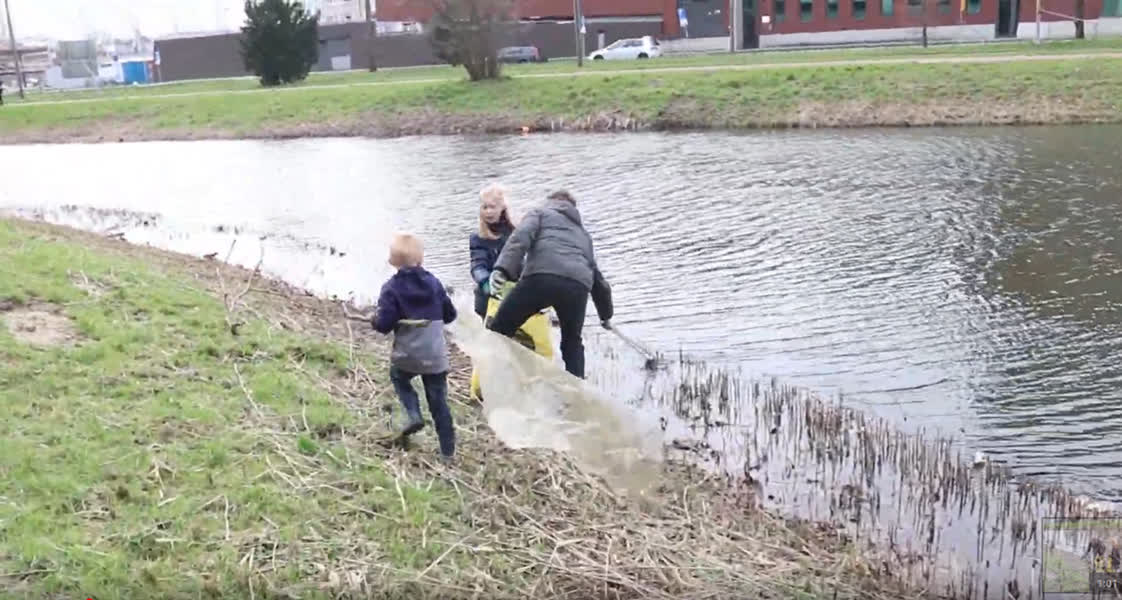 In het Overkamppark stonden zaterdag bijzondere vissers aan de oever van de sloot. Adriaan Smitsman en zijn twee kinderen Laura en Jelte waren hier namelijk naar plastic aan het vissen.