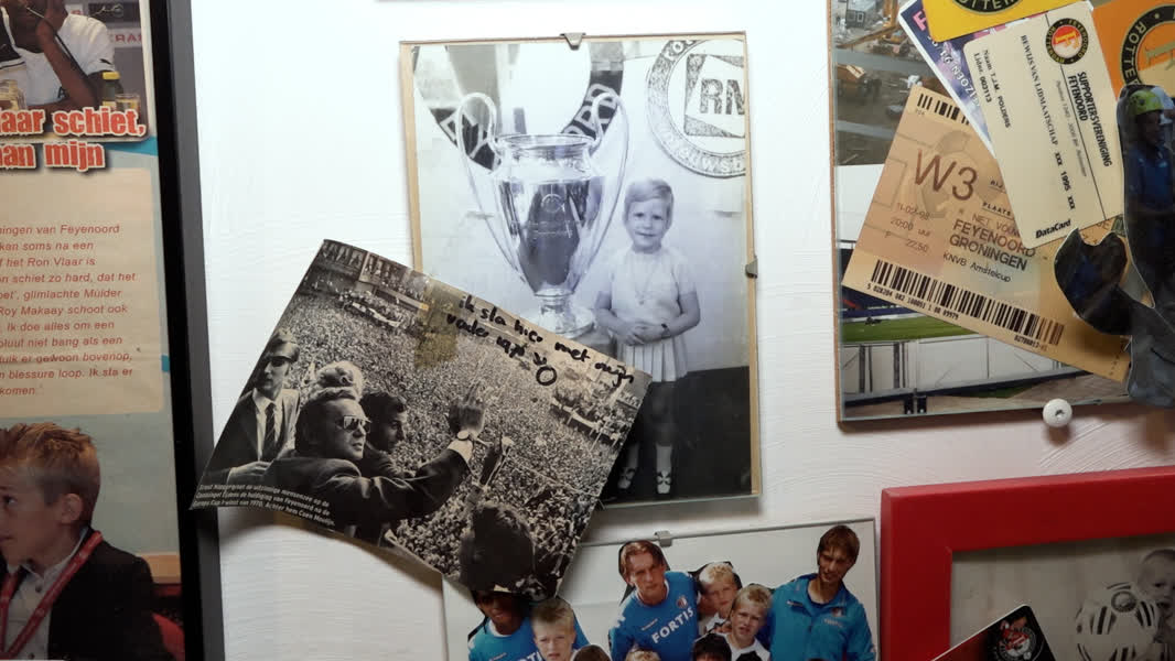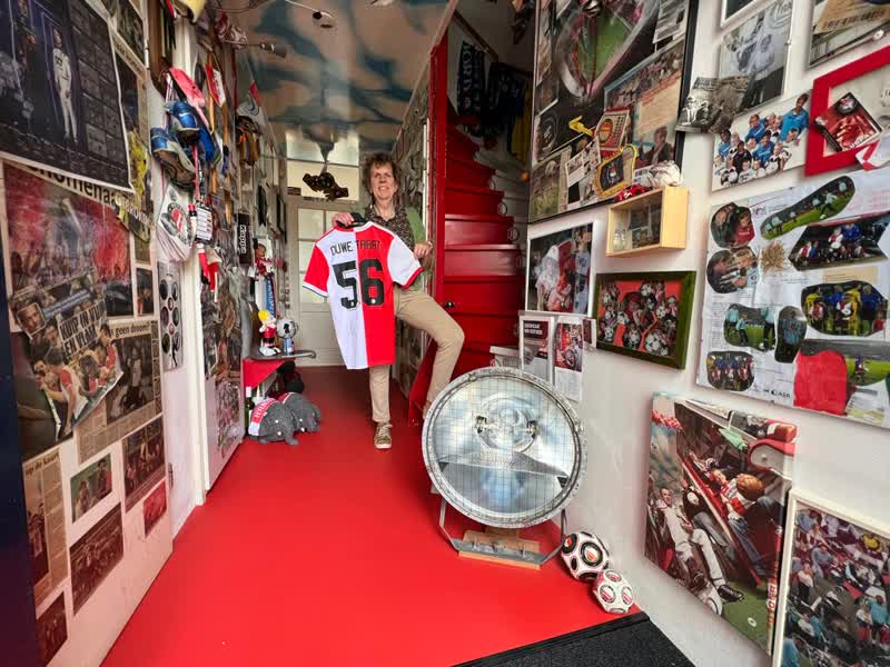 Zodra Fran-Jeanne Polders haar voordeur open doet, kijk je je ogen uit. Het halletje van haar woning in de Dordtse wijk Stadspolders ademt Feyenoord. Van stadionlamp tot een rood-witte trap, oude stoeltjes uit de Kuip (inclusief kauwgom eronder geplakt) tot aan honderden krantenknipsels, foto's en tickets: geen plekje is onbenut gelaten.
