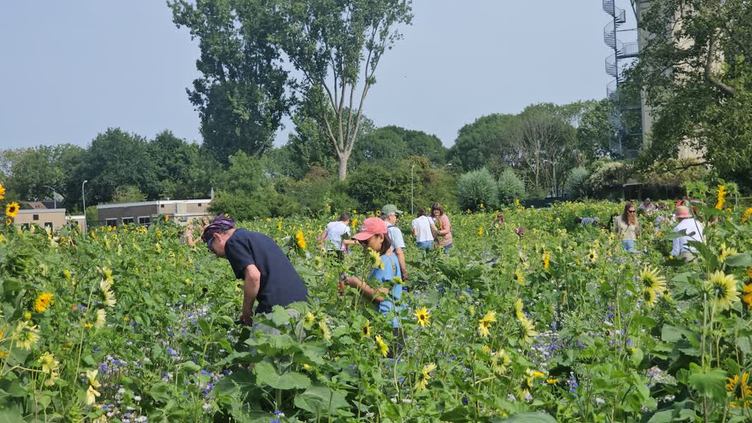 Ook bezoekers genieten zaterdag zichtbaar van de zee aan bloemen. Een jonge vrouw met een boeket zonnebloemen in haar handen vertelt: “Ik ben speciaal voor de zonnebloemen gekomen.” Een andere bezoeker, zittend op de grond tussen alle bloemen, haalt een aantal bladeren van haar bloemstelen af. “Dan is dat alvast gebeurd. Het is zo mooi hier. Ik ben nog niet klaar. Ik ga straks nog wat plukken.”