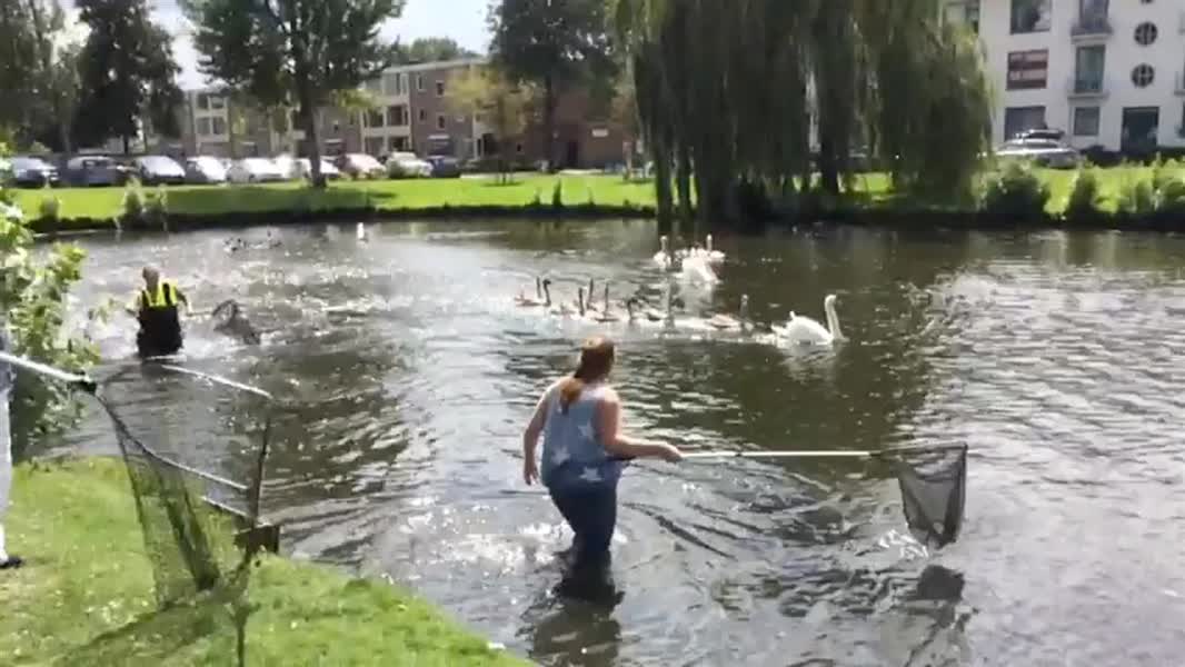 De zwanen met jongen waren telkens in gevecht met elkaar. Vanmiddag is één familie verplaatst. Om ze te vangen, moesten mensen met schepnetten het water in.