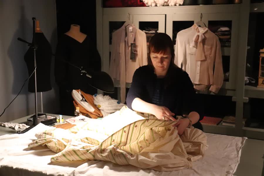 “Het zijn meters en meters stof die ik vast moet naaien, maar gelukkig kan ik tussendoor ook met de mensen in het museum praten”, vertelt textielrestaurator Floor van der Plas. “Iedereen is heel geïnteresseerd, want ze vinden het leuk om te zien dat er zo’n origineel stuk wordt gerestaureerd.”