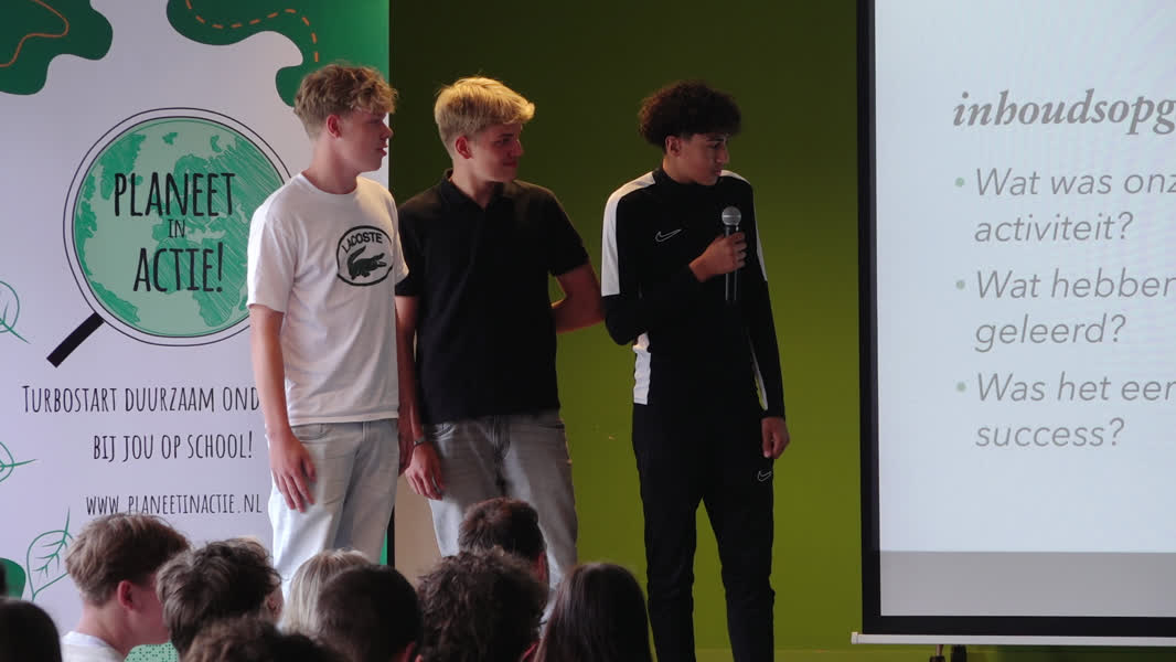 De afgelopen tien weken hebben de leerlingen lessen gehad over duurzaamheid en vooral veel zelf moeten ondernemen. Het groepje van Jayden, die ook presenteert, organiseerde een eetwedstrijd van vega-frikandellen. Zij benadrukten hoeveel water en energie er nodig is om gewone frikandellen en andere vleeswaren te produceren.