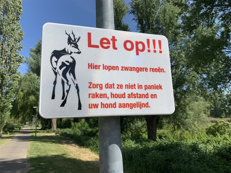 Met het bordje wordt aan passanten in de wijk naast de Hollandse Biesbosch gevraagd om afstand te houden en honden aan te lijnen als ze de dieren tegenkomen. Dmitri reageert bedenkelijk op de oproep van Handhaving Dordrecht op Twitter: "Een plaatje van een reebok terwijl het om zwangere dieren gaat.."