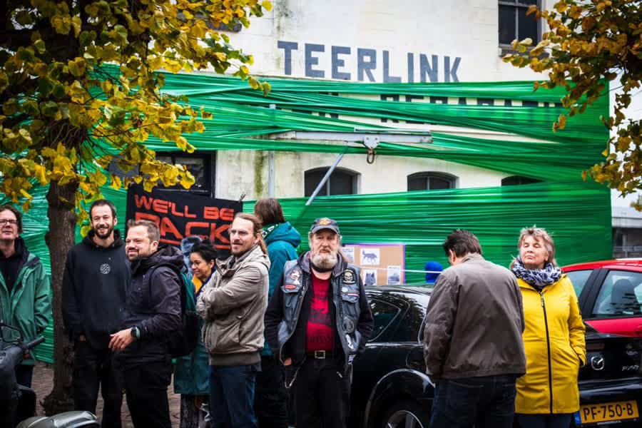 Behalve dat het gebouw in groene folie wordt gewikkeld worden er pamfletten op geplakt die aangeven dat Teerlink wordt 'onteigend'.