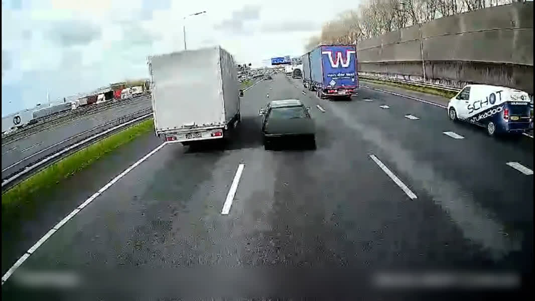 Video: vrachtwagen kan auto met pech op A15 niet meer ontwijken