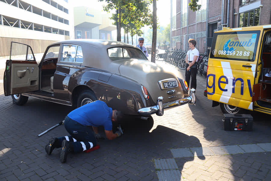 Als alle auto's op het Energieplein aan de tocht beginnen, blijft er echter één auto staan: de Rolls-Royce van Willem. "We staan effe vast, de rem is vastgelopen. Net begon hij al een beetje te roken", zegt hij, terwijl de ANWB al ter plaatse is. "We hopen dat hij hem nu weer losmaakt, zodat we zo weer kunnen vertrekken."