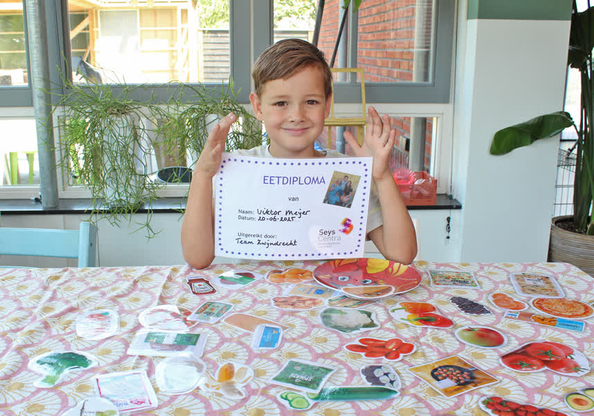 Met zijn laatste ‘eetschooldag’ zit de behandeling er nog zeker niet op. “Kenmerkend voor ARFID is ook het blijven onderhandelen. Als hij zijn bord ziet, vraagt hij al hoeveel hij moet opeten. Bij een wendag op de ‘normale’ basisschool vorige week had hij 13 druiven mee, en zei zeer overtuigend tegen de juf dat hij er maar 10 hoefde op te eten. Wij moeten daarin standvastig blijven. En hem blijven aanmoedigen, want de succeservaring is ook heel belangrijk.”