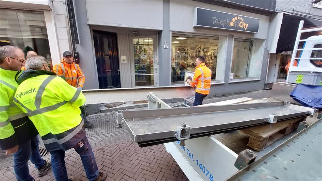 De grootste vloedschot blokkeert de Boomstraat, maar ook op de Voorstraat worden er schotten geplaatst. Het is te hopen dat het niet gebeurt maar "de bewoners weten dat zij risico lopen".
