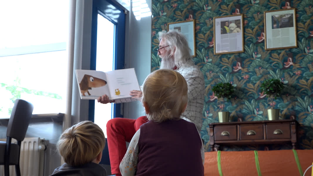 Voorlezer Gerard Laurens gaat in twee weken een aantal Dordtse wijken langs om kinderen voor te lezen uit een verschillende kinderboeken. Dat doet de theatrale muzikant op geheel eigen interactieve manier. Hij wisselt voorlezen af met gitaarspel en betrekt de kinderen bij het leesproces. Zo worden de aanwezige kids in het wijkcentrum op De Staart bijvoorbeeld om de haverklap uitgenodigd om de snuit van een hond in het boek te komen aaien en wordt ieder kind met een lied toegezongen.