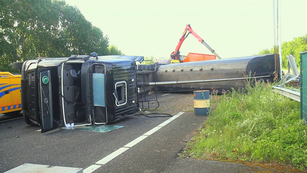 Vrachtwagen kantelt op A16