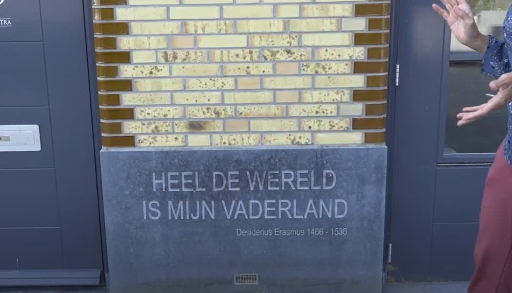 Hij belde aan en kwam in contact met de bewoners, die niet voor niets voor deze spreuk bleken te hebben gekozen. Marieke Hoekstra: "We hebben allebei in Rotterdam (geboorteplaats van Erasmus, red.) gewoond en wonen hier bij het drierivierenpunt, dat allerlei kanten van Europa verbindt. Zo kwamen we op Erasmus."