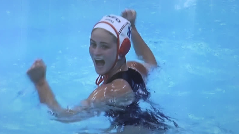 De Nederlandse waterpolosters, met de Dordtse Brigitte Sleeking in de gelederen, staan in de halve f...