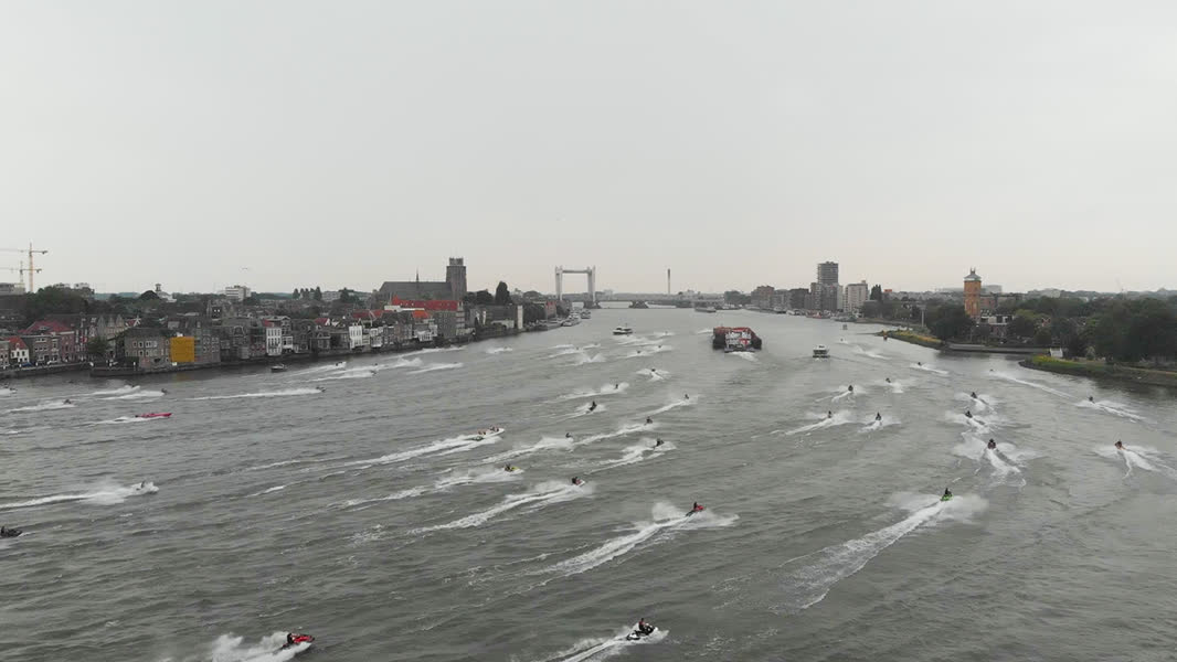 Rond het middaguur verzamelden tientallen waterscooters zich bij de Merwekade in Dordrecht, op het punt waar de Noord, Merwede en Oude Maas samenkomen. “Met zoveel mogelijk samenkomen en een leuke dag hebben,” zo omschrijft initiatiefnemer Patrick Put het doel van de tocht. “Deelnemers komen uit heel het land, en zelfs vanuit België. Zo leuk eigenlijk.”