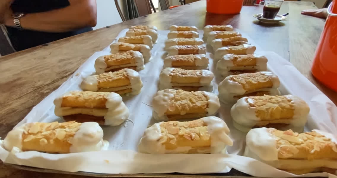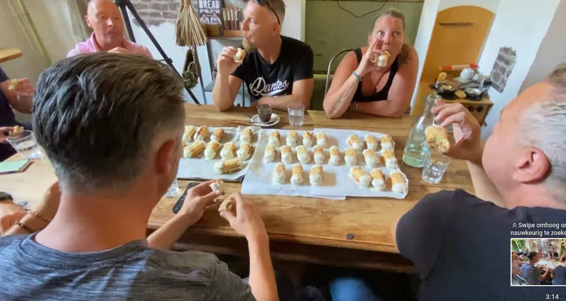 Aan de tafel in Broodcafé Jaap aan de Johan de Wittstraat in het centrum zitten acht fanatieke deelnemers, met voor zich heel veel schapenpoten. Jaap telt af en dan is het smullen. Of nou ja, smullen…. het is vooral proberen niet ziek te worden. “Iedereen zegt: ze zijn zo verschrikkelijk machtig, ik neem een halve”, legt Jaap uit. “En toen bedacht ik samen met Alex (de medebedenker van de koek): we gaan er een keer gewoon een ludieke wedstrijd van maken. Gewoon kijken: hoeveel kun je er echt op, in een kwartier tijd.” De bakker verwacht niet dat iemand er meer dan tien op kan. “Ik denk dat je bij vijf of zes echt wel zegt: ik pas.”
