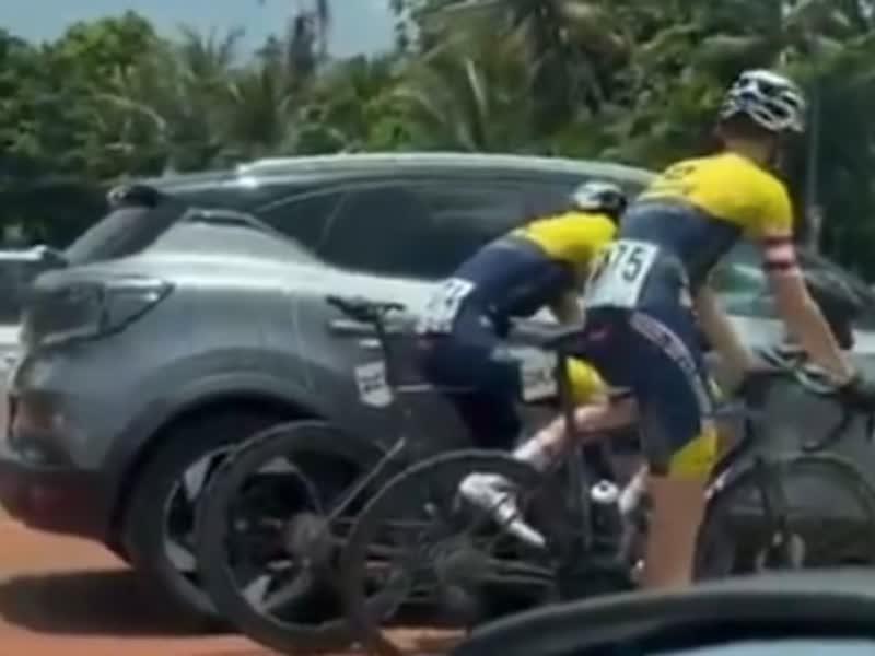 De wielrenners waren achterop geraakt door een grote valpartij. Daarom besloten ze te wachten tot de rest weer voorbij kwam. Het duo verschuilde zich achter auto's, om vervolgens stiekem weer aan te haken.