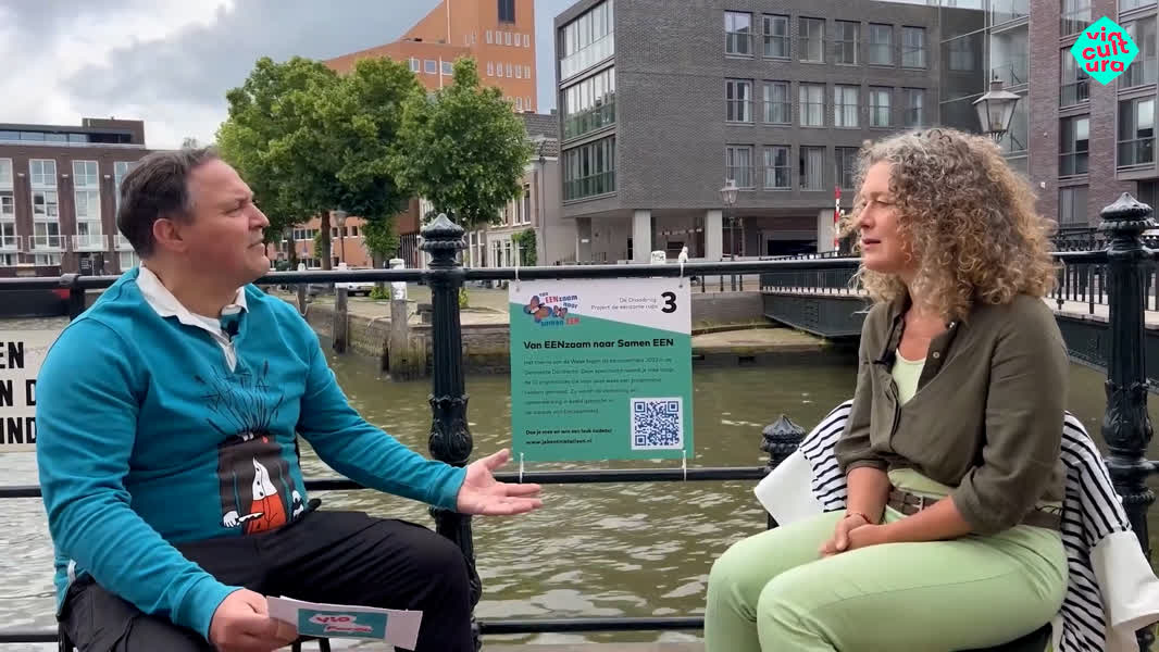 Via Cultura-host Davíd Ariza Lora ontmoet bij de draaibrug vlakbij het Teerlinkpand in Dordrecht Petra Roelofs. Zij schreef het prentenboek ‘De eenzame rups’. De prenten daarbij zijn niet getekend, maar het zijn gevilte wolschilderijtjes.