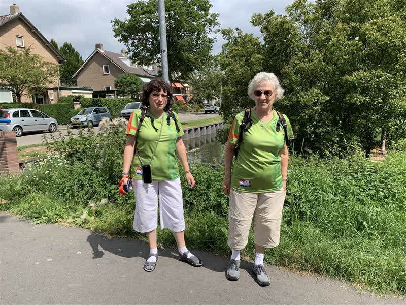 Compleet in dezelfde outfit lopen twee gevorderde wandelaarsters de aangepaste Nijmeegse vierdaagse door Dordrecht. Ook dit jaar ging de vierdaagse, vanwege de coronamaatregelen, in aangepaste stijl door. Helaas liep de derde dag voor de twee dames vanwege een zieke kat in de soep.