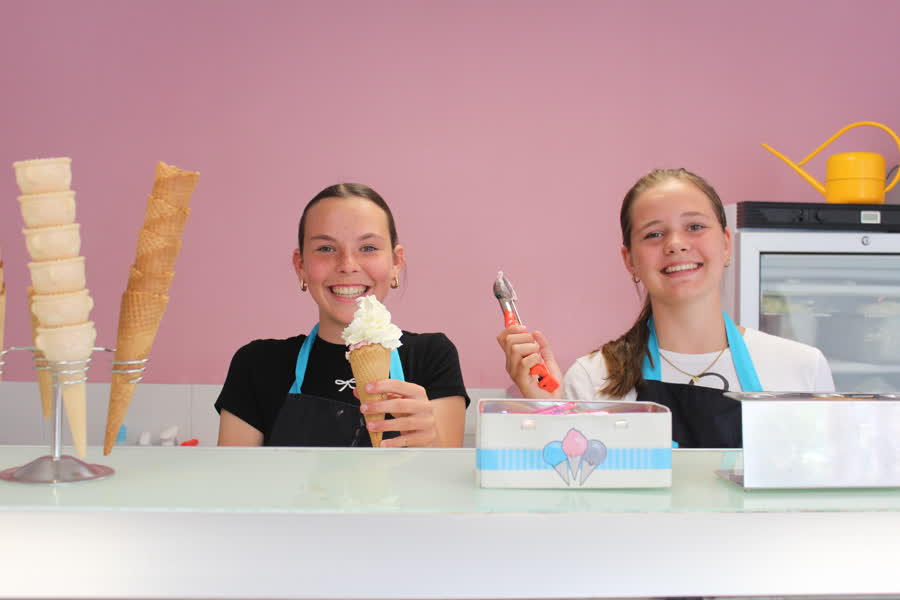 Op een dag als vandaag scheppen Jasmijn en Sifra zich een slag in de rondte, maar ze doen dat met een glimlach. Ook weten zij als geen ander welke ijssmaak dit seizoen in trek is. “Kwark-Amarena is op dit moment een hele bekende smaak. Iedereen vindt die wel lekker,” zegt Sifra.
