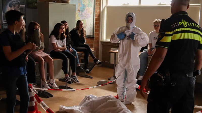 Een politieagent die met rechercheurs onderzoek doet naar een stoffelijk overschot. Je zou het niet ...