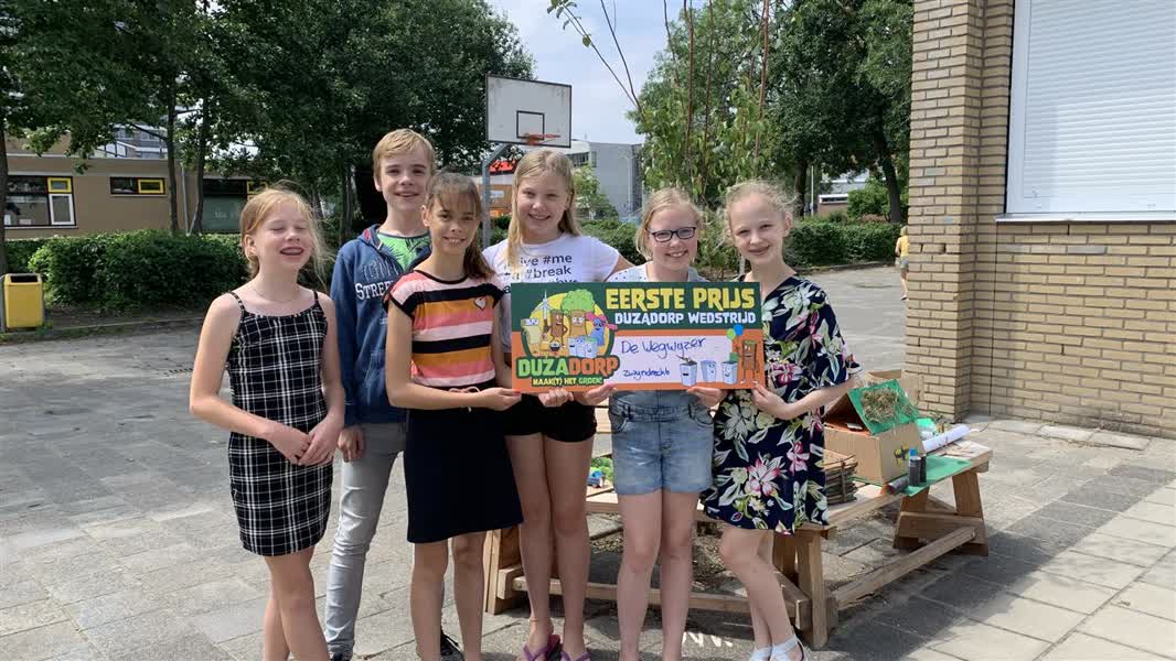 Als prijs kreeg de school onder andere een groen dak en een moestuin. Die vangen namelijk regenwater op, werken verkoelend én zijn goed voor de biodiversiteit. Om deze prijs te winnen, heeft de school allemaal plannen voor een duurzaam dorp ingezonden. Van groep 5 tot en met groep 8, ze deden allemaal vol enthousiasme mee.