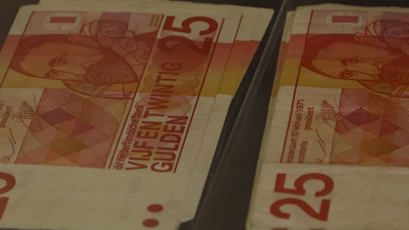 Een vol rood koffieblik met oude guldens wordt op de toonbank gezet: “Deze stond nog bij mij thuis.”...