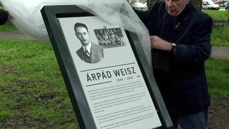 Een informatiebord langs het Árpád Weisz-pad in het Dordtse Weizigtpark vertelt sinds vrijdag het v...