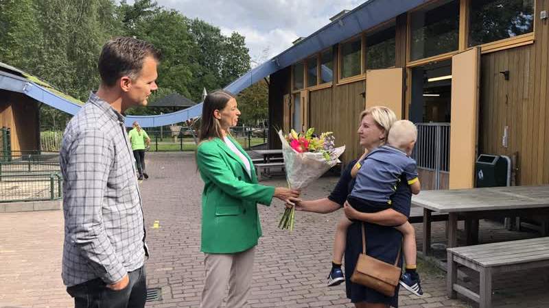 Een nietsvermoedende bezoeker van duurzaamheidscentrum Weizigt is verrast met bloemen door wethouder...