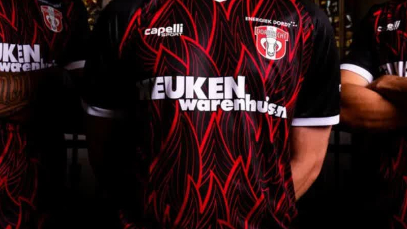 FC Dordrecht heeft een bijzonder derde shirt gelanceerd. Op het tenue is een zwart met rood vlammenp...