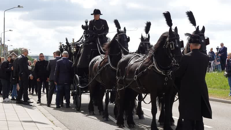 Onder een bewolkte, drukkende lucht wachten tientallen mensen totdat de koets voorbijrijdt. Op de zw...