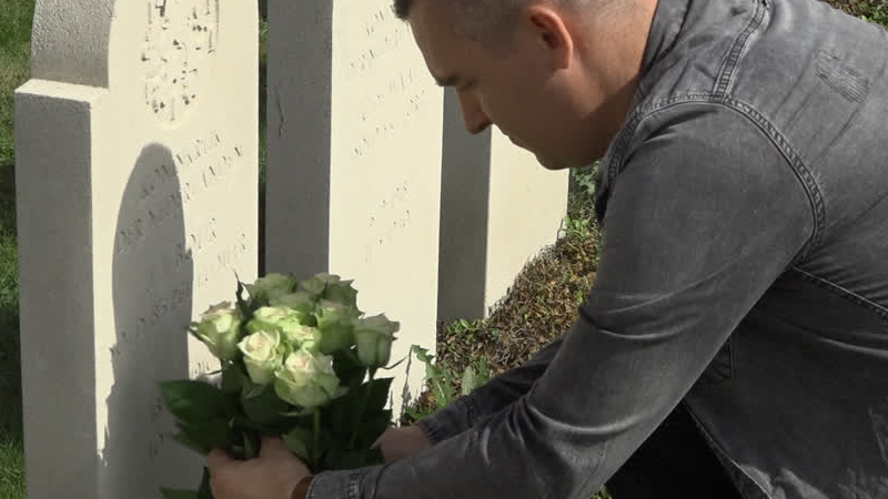 Witte stenen, vol met gegraveerde namen van gevallen soldaten in Dordrecht tijdens de Tweede Wereldo...
