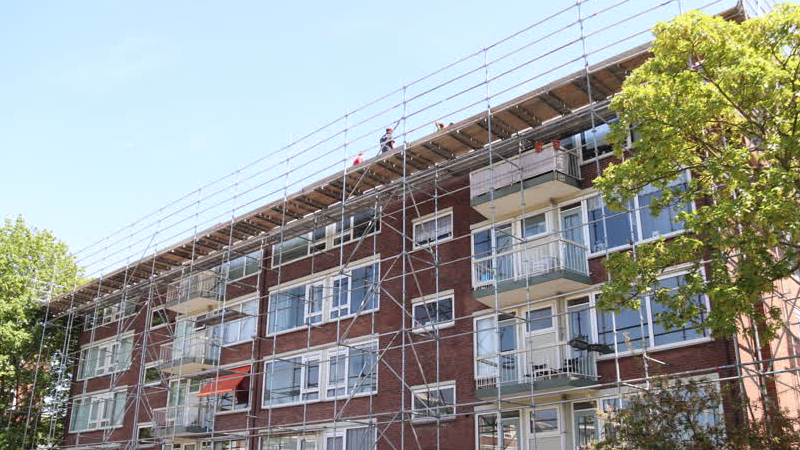 Een week na de brand op de Troelstraweg staat de getroffen portiekflat flink in de steigers. Werklui...