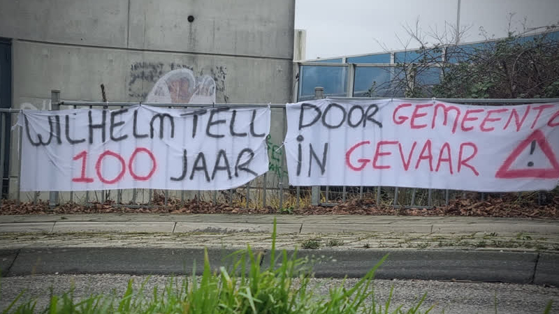 Leden van schietvereniging Wilhelm Tell in Alblasserdam hingen dit weekend spandoeken op met een noo...