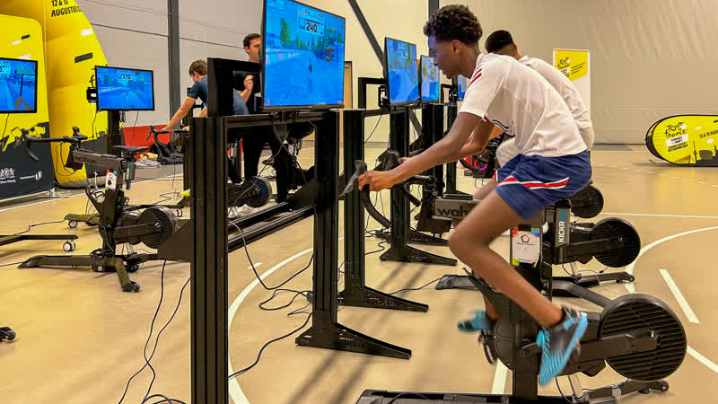 Tientallen basisschoolleerlingen op fietsen, gehuld in veiligheidshesjes, die speciale routes aflegg...