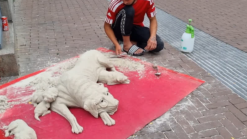 Straatkunstenaar Hadi stond afgelopen donderdagmiddag bij het Begijnhof. De jonge Roemeense kunstena...