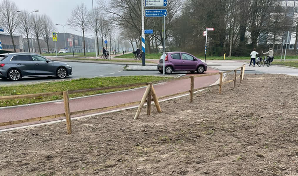 Het verwijderen van een deel van het fietspad hield mensen niet tegen om tóch over dat gedeelte te fietsen. Zo ontstond een olifantenpaadje. Het nieuw geplaatst houten hekwerk belemmert dat nu.