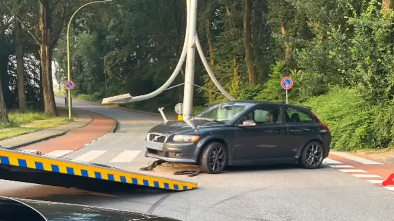 Een auto is donderdagochtend tegen een lantaarnpaal gebotst in Zwijndrecht, die daardoor doormidden ...