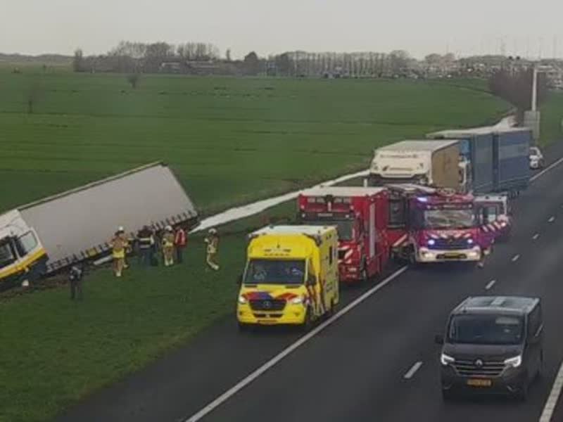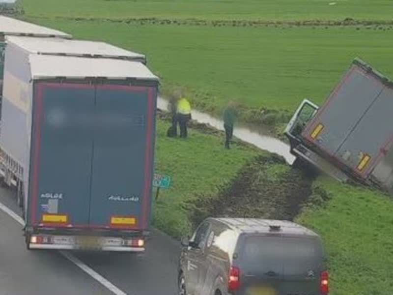 Vrachtwagen belandt in sloot naast snelweg; flinke vertraging
